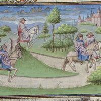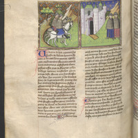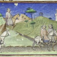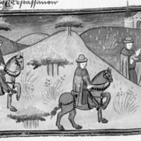 [9] Avevano in Mugello messer Forese e Giotto lor possessioni; e essendo messer Forese le sue andate a vedere, in quegli tempi di state che le ferie si celebran per le corti, e per avventura in su un cattivo ronzin da vettura venendosene, trovò il già detto Giotto, il quale similmente avendo le sue vedute se ne tornava a Firenze; il quale né in cavallo né in arnese essendo in cosa alcuna meglio di lui, sì come vecchi a pian passo venendosene insieme s’accompagnarono. [10] Avvenne, come spesso di state veggiamo avvenire, che una subita piova gli sopraprese: la quale essi, come più tosto poterono, fuggirono in casa d’un lavoratore amico e conoscente di ciascheduno di loro. [11] Ma dopo alquanto, non faccendo l’acqua alcuna vista di dover ristare e costoro volendo essere il dì a Firenze, presi dal lavoratore in prestanza due mantellacci vecchi di romagnuolo e due cappelli tutti rosi dalla vecchiezza, per ciò che migliori non v’erano, cominciarono a camminare.