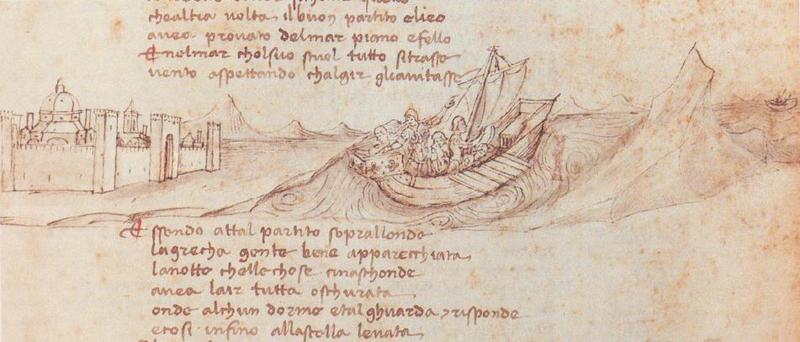 Napoli, Biblioteca Statale Oratoriana del Monumento Nazionale dei Gerolamini, C. F. 2.8, f. 5r. Il copista del manoscritto è Guido di Piero di Giovanni de Ricci. Teseo lascia la città di Atene e salpa alla volta della terra delle Amazzoni.