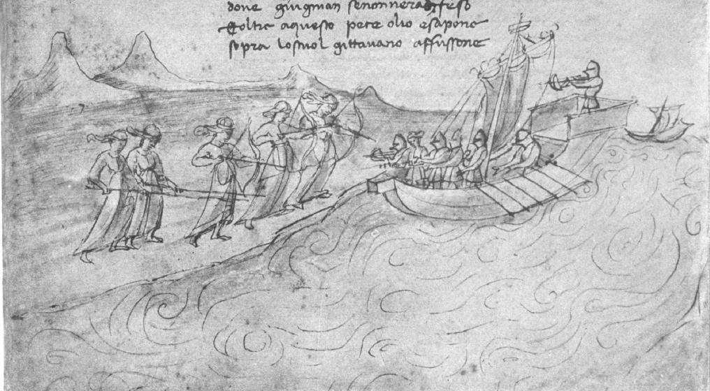 Napoli, Biblioteca Statale Oratoriana del Monumento Nazionale dei Gerolamini, C. F. 2.8, f. 8v. Il copista del manoscritto è Guido di Piero di Giovanni de Ricci. Nel tentare di sbarcare dalla nave, le truppe di Teseo vengono attaccate dalle Amazzoni armate di archi e frecce.