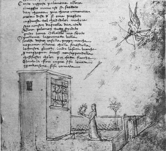 Napoli, Biblioteca Statale Oratoriana del Monumento Nazionale dei Gerolamini, C. F. 2.8, f. 31r. Il copista del manoscritto è Guido di Piero di Giovanni de Ricci. Arcita e Palemone, rinchiusi in carcere, vengono colpiti da una freccia di Cupido, innamorandosi di Emilia che passeggia nel giardino.