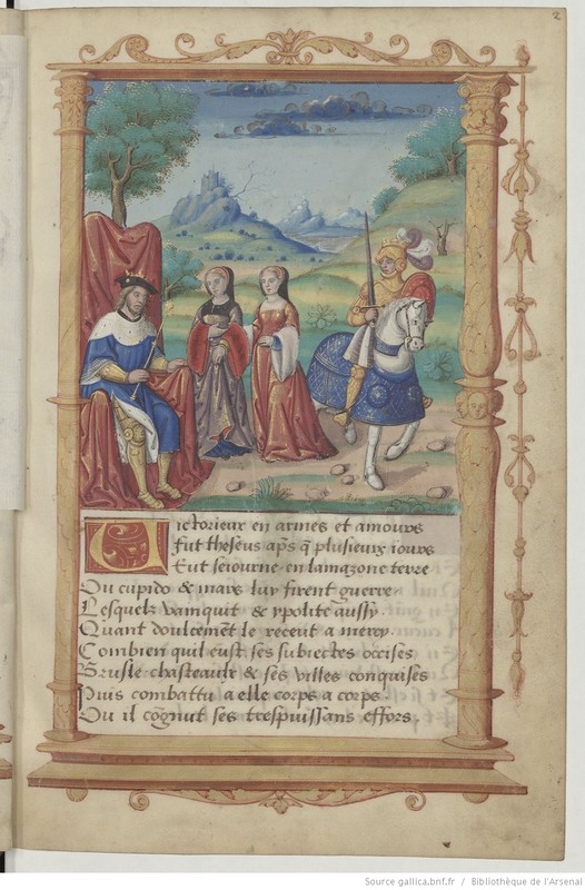 Parigi, Bibliothèque de l'Arsenal, 5116, f. 2r. Ippolita ed Emilia si trovano dinanzi a Teseo assiso in trono, mentre un cavaliere si allontana dalla scena.