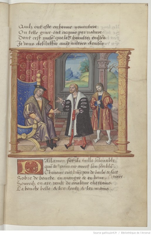 Parigi, Bibliothèque de l'Arsenal, 5116, f. 12r. Piritoo supplica Teseo per ottenere la grazia per Arcita.