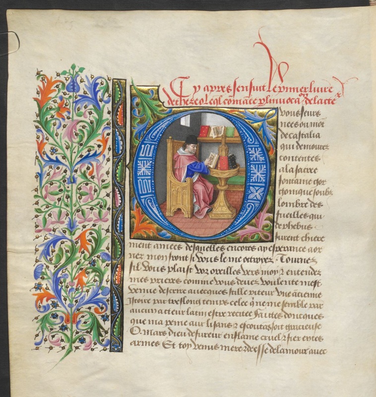 Vienna, Österreichische Nationalbibliothek, 2617, f. 17v. L'autore Giovanni Boccaccio siede nel suo studio intento a leggere un libro, all'interno dell'iniziale istoriata O (vous).