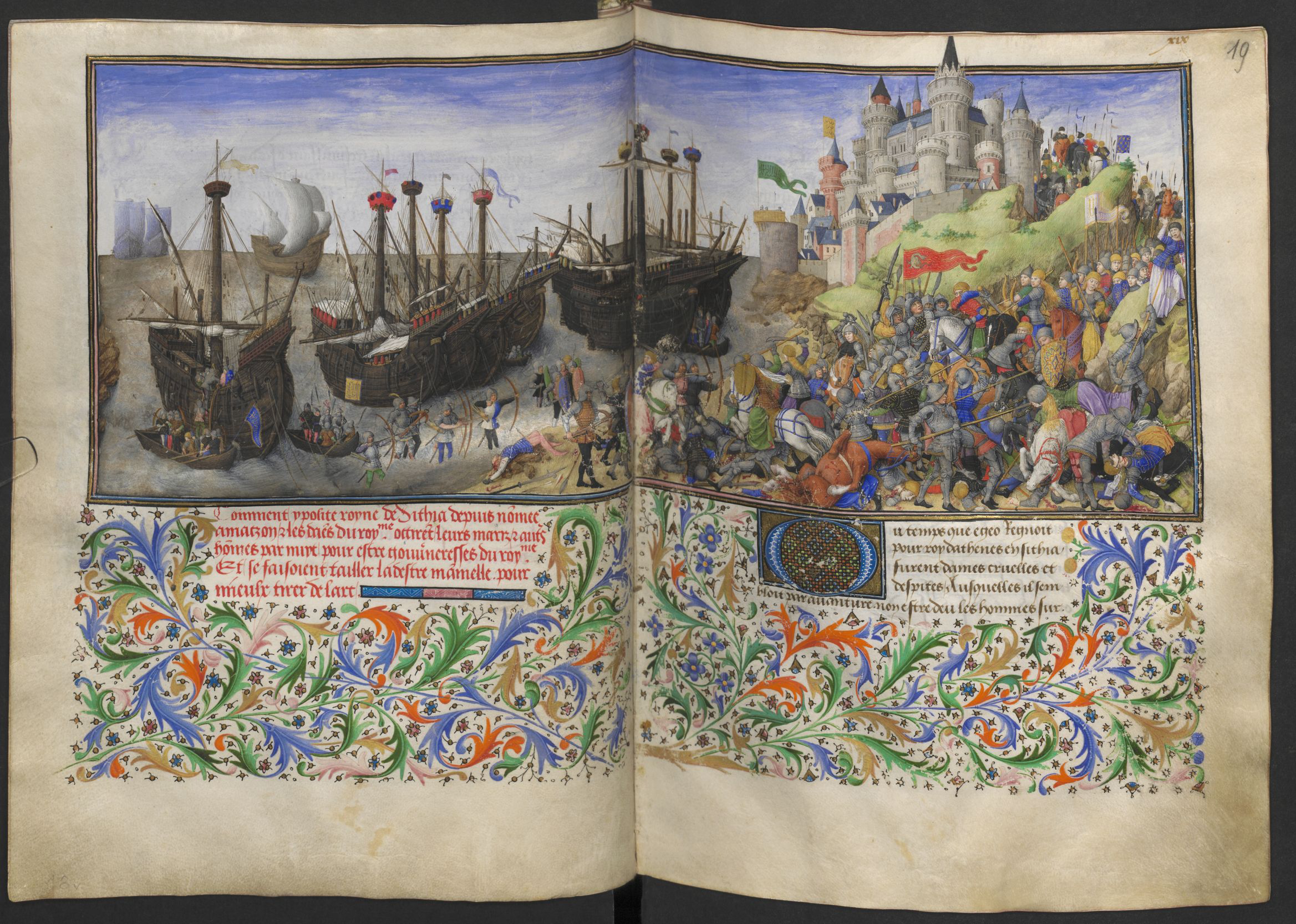 Vienna, Österreichische Nationalbibliothek, 2617, ff. 18v-19r. L'illustrazione di estende su due carte, e rappresenta lo sbarco dell'esercito greco guidato da Teseo e la battaglia contro le guerriere Amazzoni.