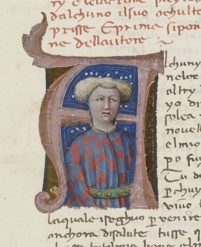 Parigi, Bibliothèque Nationale de France, It. 492, f. 8r. Ritratto a mezzobusto di un giovane uomo (Troiolo?), all'interno dell'iniziale figurata A(lchuni).