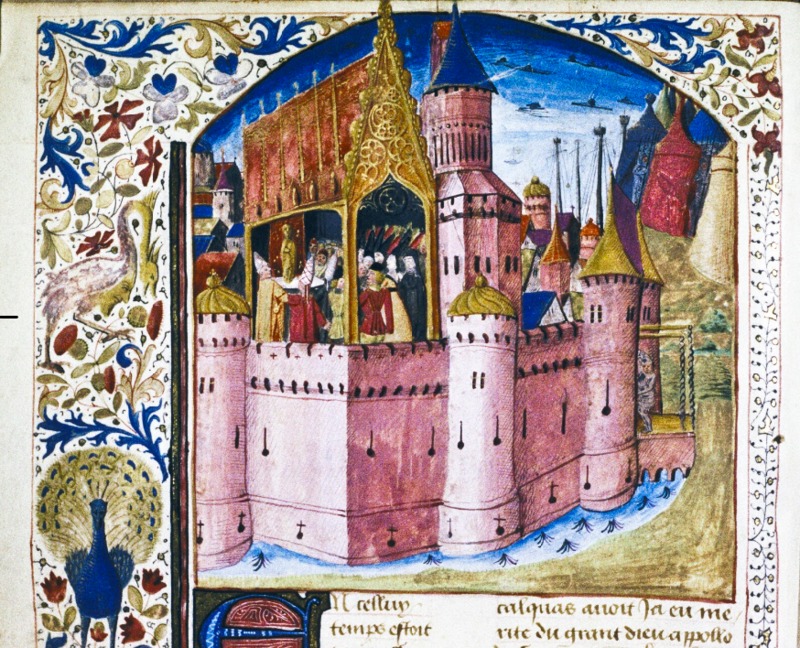 Oxford, Bodleian Library, Douce 331, f. 2v. Una folla di personaggi si trova nel tempio all'interno delle mura di Troia; sullo sfondo si vedono l'accampamento greco e i pennoni delle navi ferme all'ancora.