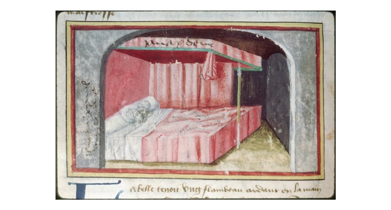 Tours, Bibliothèque Municipale, 0956, f. 23v. Troiolo e Criseide giacciono insieme nel letto.
