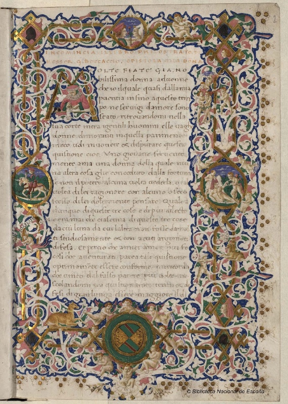 Madrid, Biblioteca Nacional de España, Vit. 16.3, f. 2r. Ritratto dell'autore Giovanni Boccaccio intento a scrivere, all'interno dell'iniziale figurata a bianchi girari M(olte); nel fregio marginale a bianchi girari sono inseriti tre medaglioni, raffiguranti Troiolo a cavallo con un fiore tra le mani (margine sinistro), Criseide distesa in un prato con due puttini (margine destro), i profili affrontati dei due protagonisti (margine superiore).