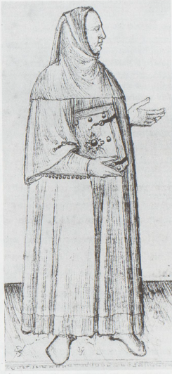Firenze, Biblioteca Nazionale Centrale, II.II.38, f. 3v. Il copista del manoscritto, datato 23 ottobre 1397, è Rigo d'Alessandro Rondinelli. Ritratto a figura intera di Giovanni Boccaccio con un libro tra le mani.