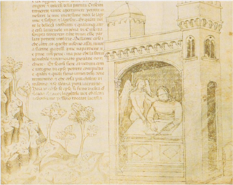 Firenze, Biblioteca Nazionale Centrale, II.II.90, f. 67r. All'interno del suo studio l'autore riceve l'ispirazione da un angelo.