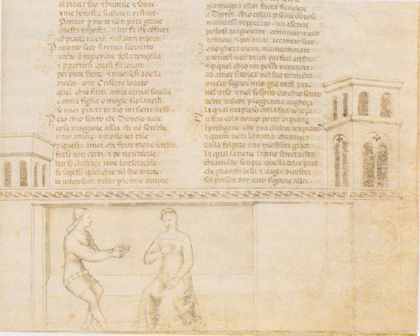 Firenze, Biblioteca Nazionale Centrale, II.II.90, f. 73r. Pandaro corteggia Criseide per conto dell'amico Troiolo.