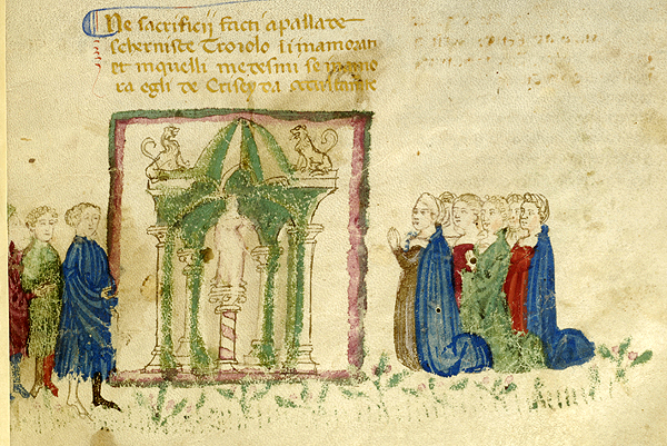 New York, Pierpont Morgan Library, M 371, f. 6r. Il copista del manoscritto, datato ottobre 1414, è Pace di Giuliano da Olibano. Troiolo, accompagnato da Pandaro, scorge Criseide in preghiera insieme ad altre donne nel tempio di Atena.