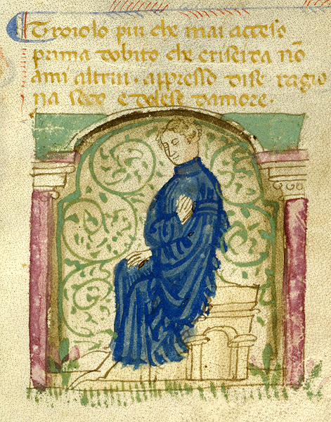 New York, Pierpont Morgan Library, M 371, f. 8r. Il copista del manoscritto, datato ottobre 1414, è Pace di Giuliano da Olibano. Troiolo siede in solitudine, la mano destra posata sul cuore.