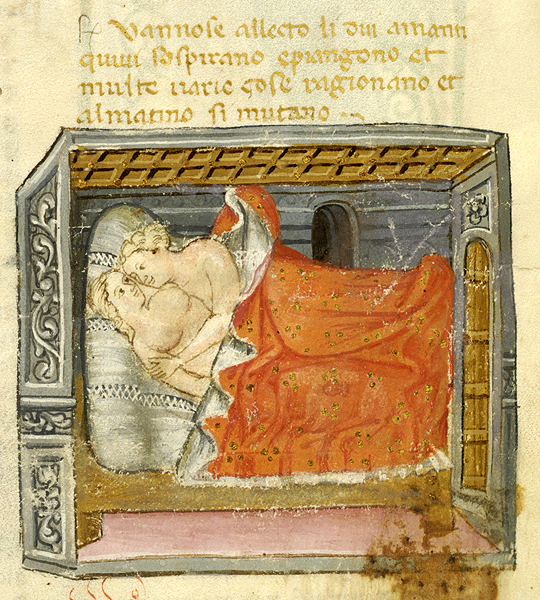 New York, Pierpont Morgan Library, M 371, f. 35v. Il copista del manoscritto, datato ottobre 1414, è Pace di Giuliano da Olibano. Troiolo giace con Criseide.