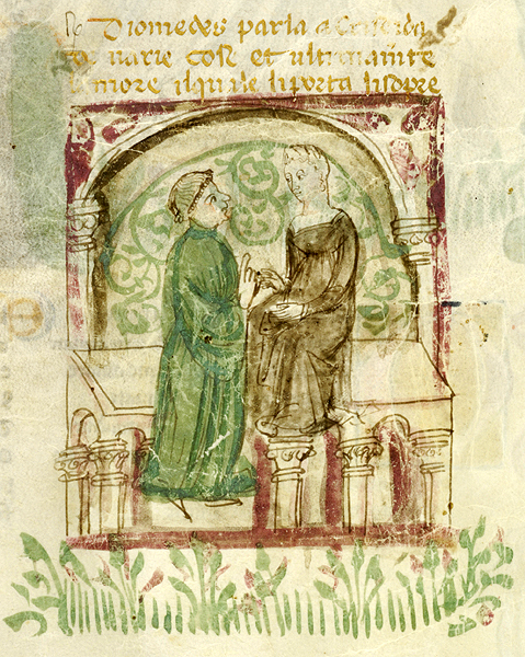 New York, Pierpont Morgan Library, M 371, f. 44v. Il copista del manoscritto, datato ottobre 1414, è Pace di Giuliano da Olibano. Diomede conversa con Criseide.