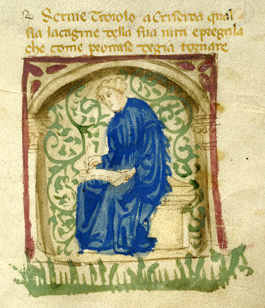 New York, Pierpont Morgan Library, M 371, f. 50r. Il copista del manoscritto, datato ottobre 1414, è Pace di Giuliano da Olibano. Troiolo scrive una lettera a Criseida.