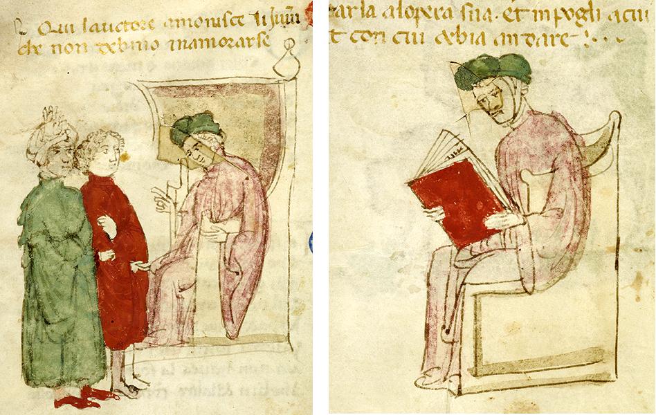 New York, Pierpont Morgan Library, M 371, f. 56v. Il copista del manoscritto, datato ottobre 1414, è Pace di Giuliano da Olibano. L'autore Giovanni Boccaccio arringa due giovani; Boccaccio in cattedra legge un libro.