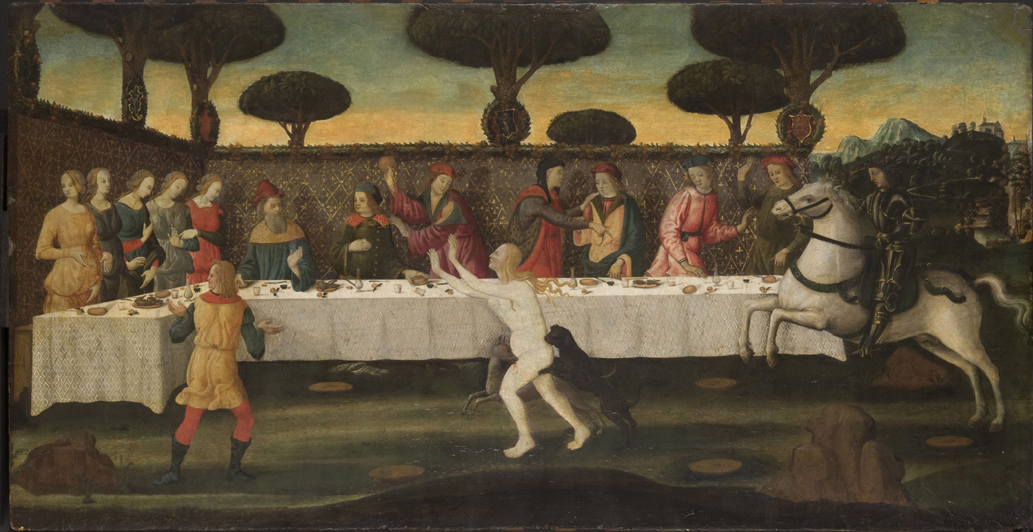Philadelphia (Pa.), Philadelphia Museum of Art, inv. n. Cat. 64. Nastagio degli Onesti allestisce un banchetto, durante il quale si manifesta la visione della caccia infernale causando terrore e sgomento nei convitati, tra cui è presente anche la figlia di Paolo Traversari.