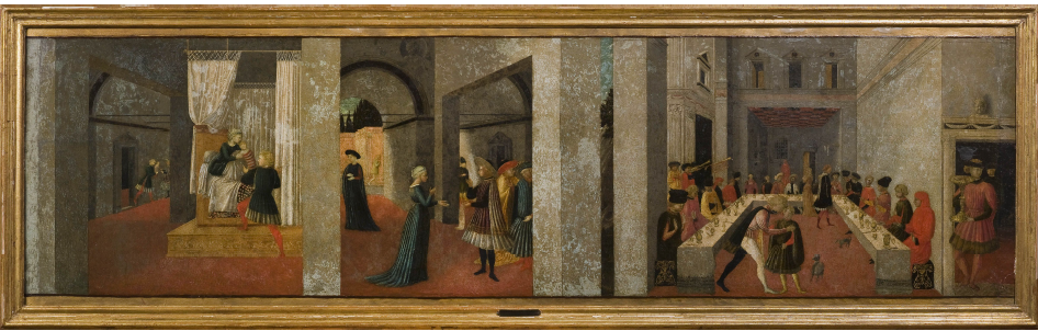 Ambito di Benozzo Gozzoli (1445 c.), Griselda consegna la figlia al messo di Gualtieri; il messo consegna la neonata al marchese; Gualtieri ripudia Griselda, la quale è costretta a tornare alla casa paterna; durante il banchetto Gualtieri rivela la verità a Griselda
