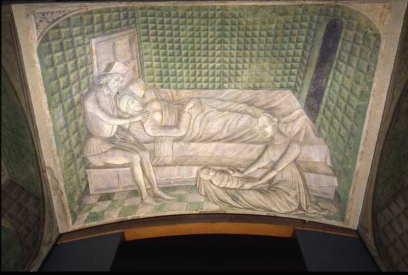 Milano, Pinacoteca del Castello Sforzesco, inv. n. 1347/12. Griselda dà alla luce una bambina, assistita da Gualtieri e da una fantesca.