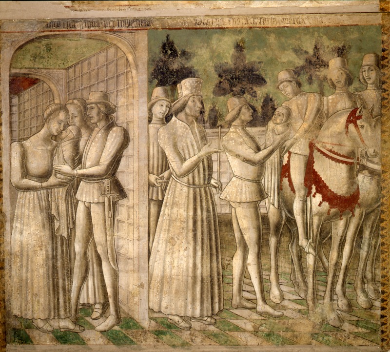 Milano, Pinacoteca del Castello Sforzesco, inv. n. 1347/14. Griselda bacia la figlia prima di separarsene e consegnarla al famiglio; Gualtieri ordina ai suoi servitori di portare la bambina dai conti di Panago.