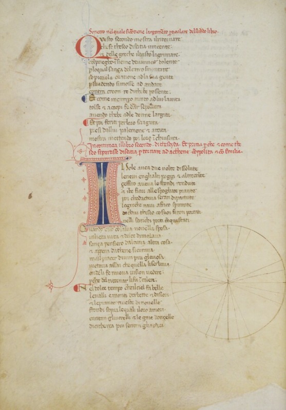 Membr., cc. I + 141 + I’, mm. 275 × 195. Caduta una carta tra le attuali 137 e 138 e, con ogni probabilità, le due carte finali dell’ultimo fascicolo. "Teseida". Databile attorno agli anni 1345-1350. Di mano del B. anche: frequenti postille e notazioni interlineari coeve alla copia o piú tarde; la manicula, accompagnata da graffa, nel margine sinistro della c. 33v, il disegno astronomico alla c. 18v, la cornice floreale in cui è inscritta la “F” di “Fiammetta” alla c. 64v. Di dubbia paternità boccacciana il disegno posto nella metà superiore della carta incipitaria raffigurante l’autore (assegnato al B. dalla Ciardi Dupré dal Poggetto); lasciati in bianco gli altri spazi destinati alle illustrazioni. Interventi marginali di mani dei secc. XIV, XV e XVI. Appartenuto nel sec. XIX all’erudito francese Stefano Audin, passò poi alla biblioteca di Lord Vernon.