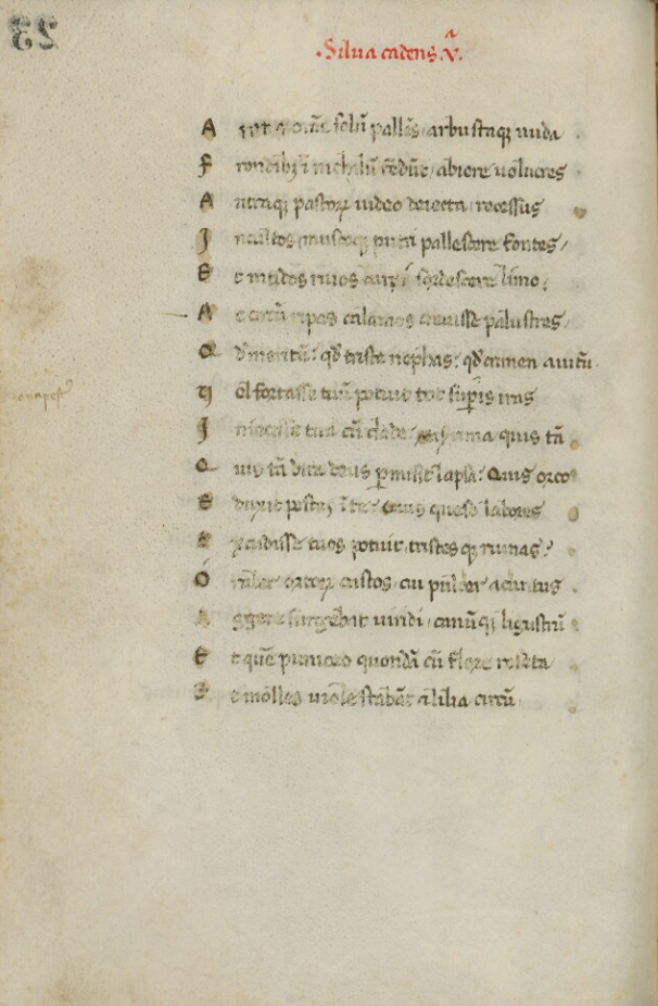 Membr., cc. I + 90 + I’, mm. 161 × 111. "Buccolicum carmen". Segnatura della parva libraria: V 12. Databile per ragioni testuali ad un periodo compreso tra il 1362-1363 (viaggio del B. a Napoli) e il 1367 (termine ante quem per la composizione della XVI egloga); ragioni paleografiche portano a propendere per gli anni 1362-1363. Frequenti postille di mano del B. coeve alla copia, spesso in scrittura a penna rovesciata (ad es. alla c. 22v).