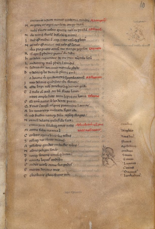 Membr., cc. III + 145 + IV’, mm. 240 × 160. M.V. Martialis, "Epigrammata"; Giovanni di Salisbury, "Entheticus in Policraticum"; D.I. Iuvenalis, "Satyrae", X 22. Segnatura della parva libraria: VI 7. Argomenti paleografici spingono ad assegnarlo ad un periodo compreso tra la fine degli anni ’60 e i primissimi anni ’70, ma riferimenti culturali nello scambio epistolare con Petrarca, portano a non escludere la possibilità che sia anteriore di qualche anno. Di mano del B. anche: diverse annotazioni, graffe di varia tipologia (ad es. cc. 98r e 103v), fiorellini (ad es. c. 115v), maniculae abituali (ad es. c. 23r) e altre che riproducono il gesto delle “fiche” dantesche (ad es. c. 35v). Da assegnare al B. anche cinque disegni: il busto di una fanciulla con corona floreale e quello di un uomo barbuto coronato di alloro (c. 10r), un serpente con la testa di uccello (c. 22v), un cappuccio fratesco (c. 24v), un profilo maschile (c. 75v), una testina barbuta raffigurante Seneca (c. 115v). Rare postille di altre mani databili tra la fine del XV e l’inizio del XVI secolo (ad es. cc. 62v e 65r).