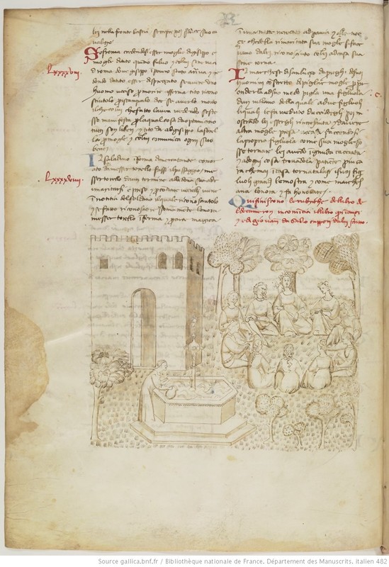 Membr., cc. III + 215 + III’, mm. 334 × 239. "Decameron". Risalente agli anni ’60 del sec. XIV. La copia è di mano di Giovanni d’Agnolo Capponi, che si sottoscrive in calce alla tavola delle rubriche (c. 4v) e si serve di una mercantesca con lievi influenze della cancelleresca (e non alla mano del B. come erroneamente ipotizzato dal Rossi). Al Capponi devono essere attribuiti anche frequentissimi interventi correttori in interlinea. Forse di mano del B. una nota interlineare (segnalata da Cursi): «Açço» (c. 69v). Diciotto disegni a penna (cc. 4v, 5r, 6r, 11r, 23v, 55r, 79v, 82r, 102r, 122v, 133v, 151r, 176r, 187r, 189r, 214r) assegnati al B. dalla Ciardi Dupré dal Poggetto, ma a nostro avviso di mano differente, come recentemente sostenuto anche dalla Battaglia Ricci.
