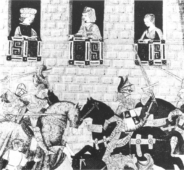 Ubicazione ignota. Dalle finestre di un palazzo Teseo, Ippolita ed Emilia osservano Arcita e Palemone darsi battaglia con i loro eserciti; in primo piano è raffigurato Arcita disarcionato dal proprio cavallo.