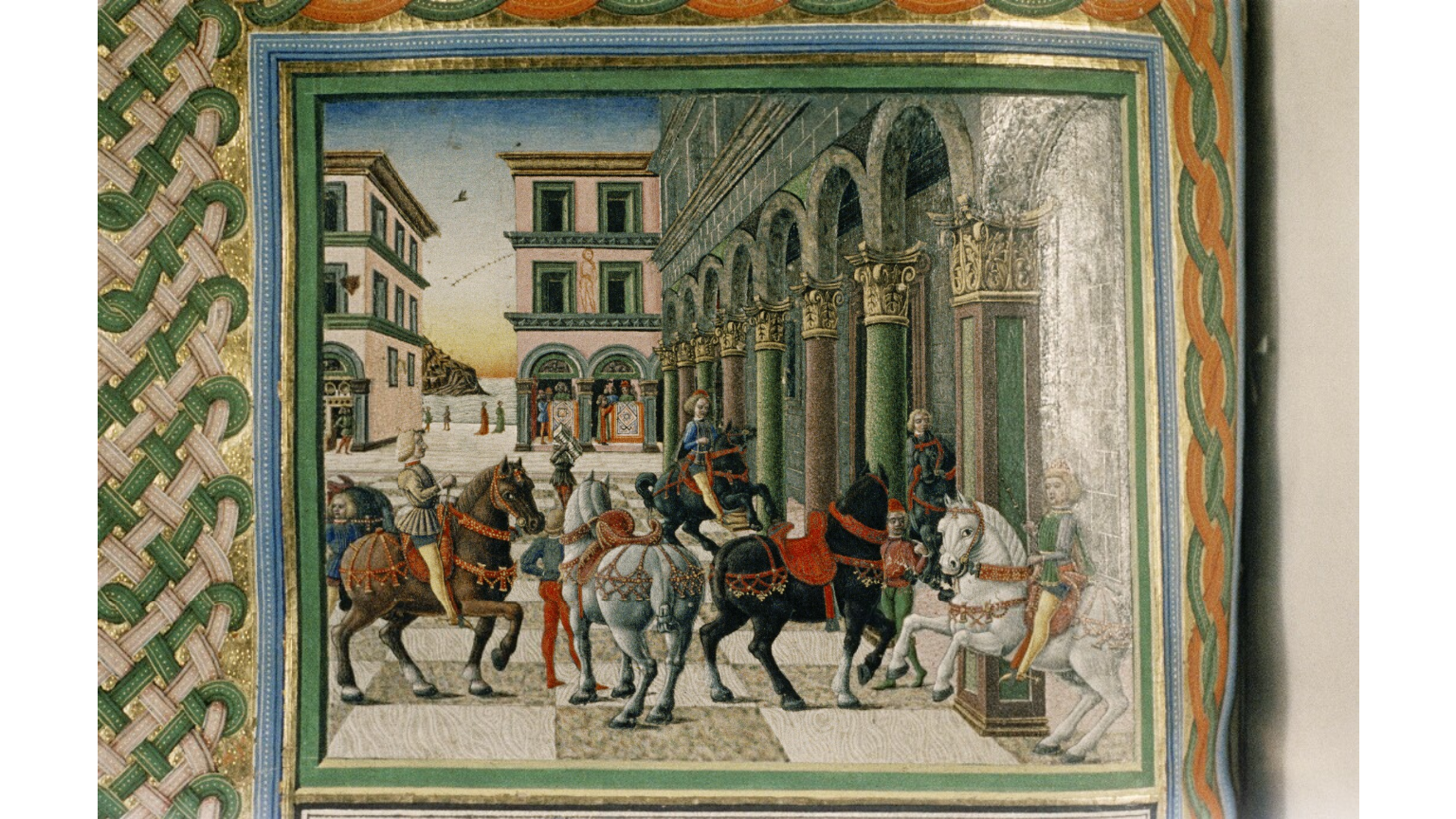 Oxford, Bodleian Library, Canon. Ital. 85, f. 114v. Il copista del manoscritto è Andrea de Laude (Andrea da Lodi). Florio e i suoi compagni sono a cavallo in una piazza.