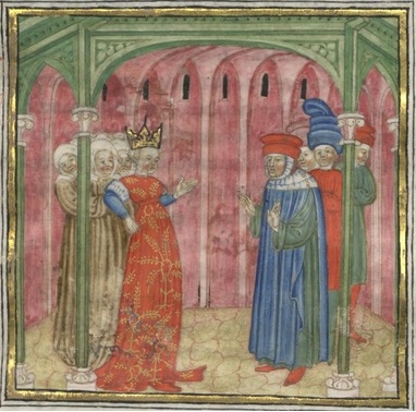 Kassel, Universitätsbibliothek Kassel, Landesbibliothek und Murhardsche Bibliothek der Stadt Kassel, 2° poet. et roman. 3, f. 2v. Fiammetta, vestita di rosso e incoronata, si reca dal poeta con un seguito di donne per chiedere che Boccaccio narri la storia di Florio e Biancifiore.