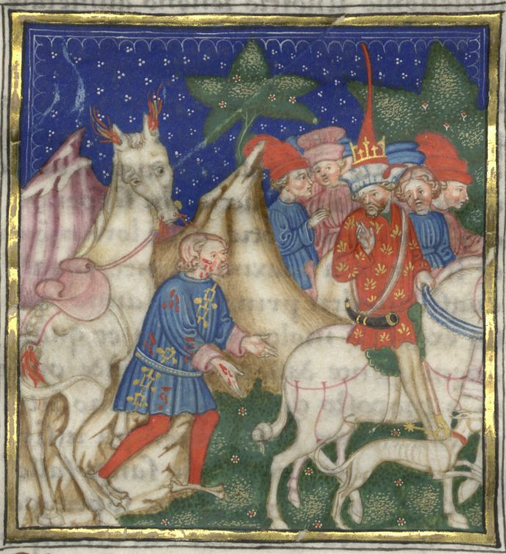 Kassel, Universitätsbibliothek Kassel, Landesbibliothek und Murhardsche Bibliothek der Stadt Kassel, 2° poet. et roman. 3, f. 6v. Il Diavolo si presenta sotto le mentite spoglie di un cavaliere ferito al re di Spagna Felice, accusando ingiustamente Lelio di aver attaccato la città di Marmorina (Verona).