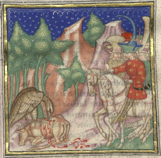 Kassel, Universitätsbibliothek Kassel, Landesbibliothek und Murhardsche Bibliothek der Stadt Kassel, 2° poet. et roman. 3, f. 7ar. Il re Felice indica ai suoi uomini l'aquila che si nutre del toro offerto in sacrificio, interpretandolo come un presagio favorevole.