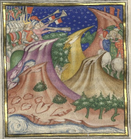Kassel, Universitätsbibliothek Kassel, Landesbibliothek und Murhardsche Bibliothek der Stadt Kassel, 2° poet. et roman. 3, f. 8v. L'esercito di Re Felice, composto di cavalieri, fanti e trombettieri, giunge in vista della compagnia di Lelio e Giulia.