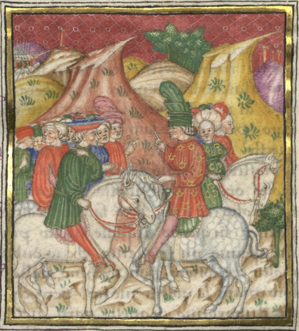 Kassel, Universitätsbibliothek Kassel, Landesbibliothek und Murhardsche Bibliothek der Stadt Kassel, 2° poet. et roman. 3, f. 9r. Alla vista dell'esercito in lontananza, Lelio conforta i suoi compagni.