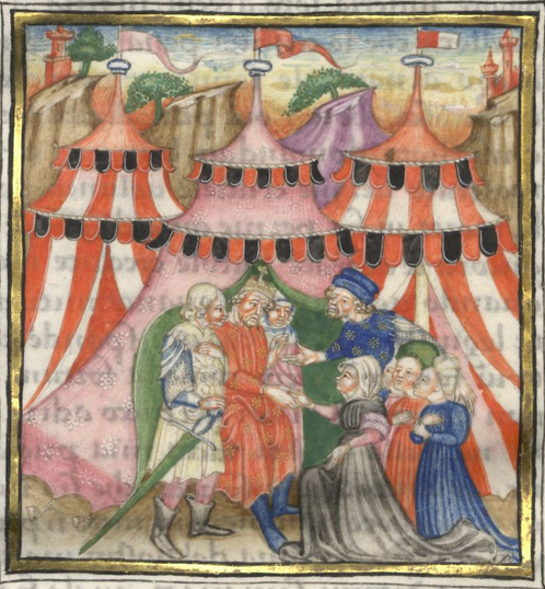 Miniatore lombardo (1450 c.), Il re riceve Giulia all'interno della sua tenda