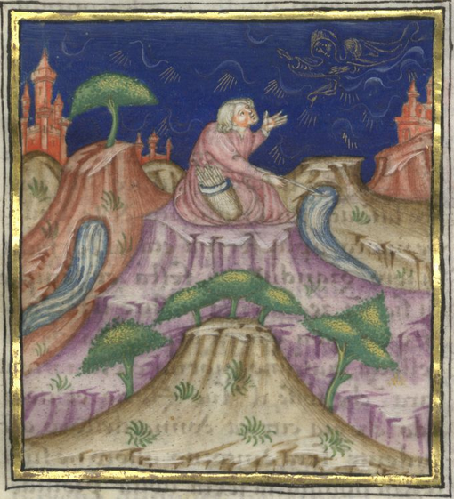 Kassel, Universitätsbibliothek Kassel, Landesbibliothek und Murhardsche Bibliothek der Stadt Kassel, 2° poet. et roman. 3, f. 22v. La dea Venere, raffigurata come una sagoma dorata tra le nubi, appare al figlio Cupido, il quale sta temprando nove frecce in un fiume sulla cima del monte di Citera.