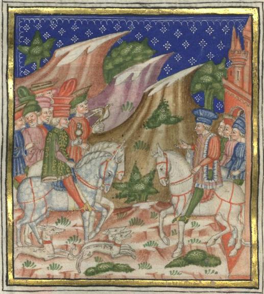 Kassel, Universitätsbibliothek Kassel, Landesbibliothek und Murhardsche Bibliothek der Stadt Kassel, 2° poet. et roman. 3, f. 34v. La compagnia di Florio, recante cani da caccia e falconi, giunge alle porta della città di Montoro, dove è attesa dal duca con il suo seguito.