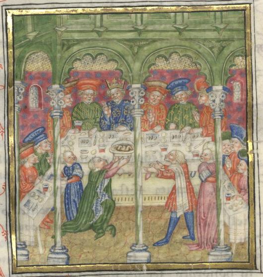Kassel, Universitätsbibliothek Kassel, Landesbibliothek und Murhardsche Bibliothek der Stadt Kassel, 2° poet. et roman. 3, f. 39v. Durante il banchetto Biancifiore serve al re il pavone avvelenato.