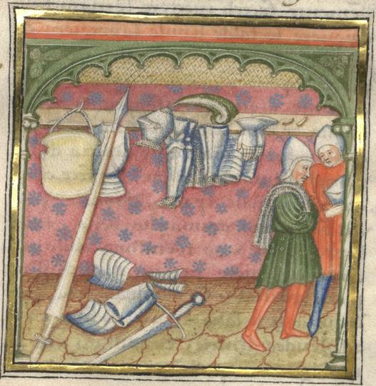 Miniatore lombardo (1450 c.), Gli scudieri si recano nell'armeria