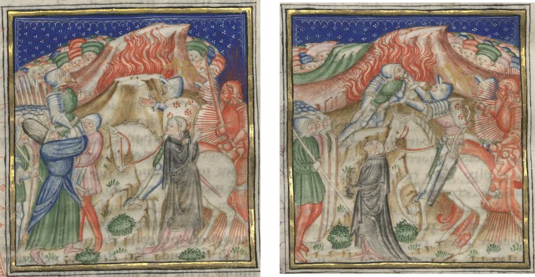 Miniatore lombardo (1450 c.), I sergenti sostengono il siniscalco morente; Florio getta il siniscalco nel fuoco
