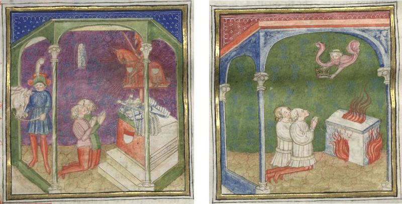 Kassel, Universitätsbibliothek Kassel, Landesbibliothek und Murhardsche Bibliothek der Stadt Kassel, 2° poet. et roman. 3, f. 61v. La carta presenta due miniature: Florio e Ascalion, inginocchiati dinanzi all'altare di Marte, offrono le loro armi al dio; i due cavalieri, inginocchiati nel tempio di Venere, ricevono la visita della dea che reca la corona del trionfo di Florio.