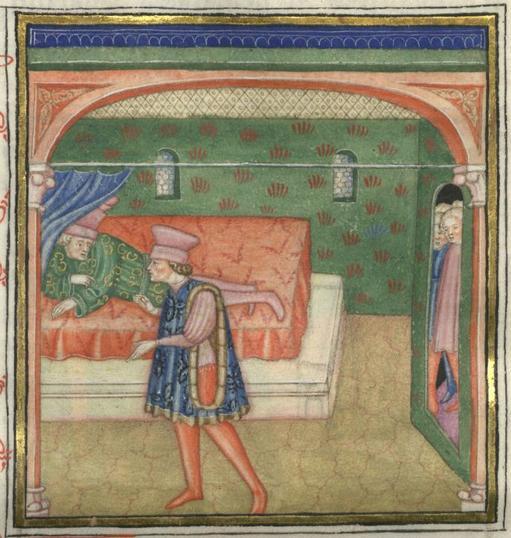 Kassel, Universitätsbibliothek Kassel, Landesbibliothek und Murhardsche Bibliothek der Stadt Kassel, 2° poet. et roman. 3, f. 64v. Il duca di Montoro conforta Florio, il quale giace disteso sul letto.