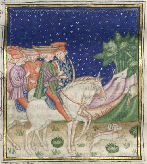 Kassel, Universitätsbibliothek Kassel, Landesbibliothek und Murhardsche Bibliothek der Stadt Kassel, 2° poet. et roman. 3, f. 65v. Florio si reca a caccia con i suoi compagni su consiglio del duca per nascondere il suo dolore.