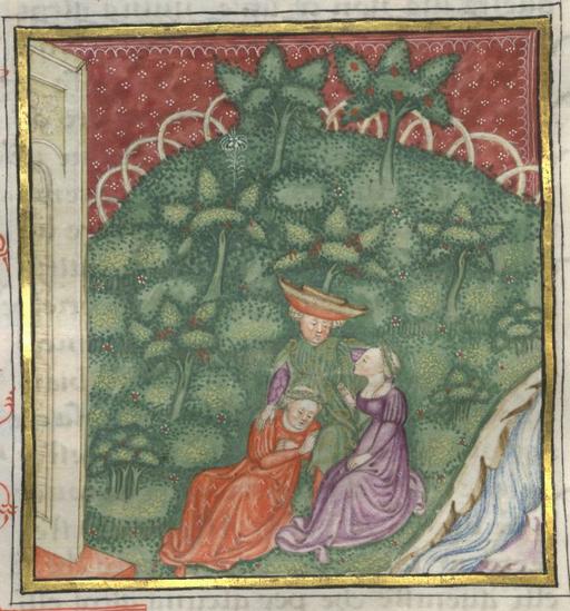 Kassel, Universitätsbibliothek Kassel, Landesbibliothek und Murhardsche Bibliothek der Stadt Kassel, 2° poet. et roman. 3, f. 67v. Florio siede nel giardino accanto ad una fonte con le due fanciulle strette a sé.