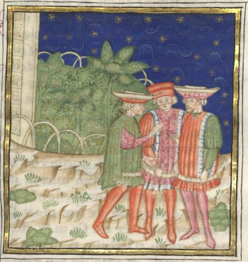 Kassel, Universitätsbibliothek Kassel, Landesbibliothek und Murhardsche Bibliothek der Stadt Kassel, 2° poet. et roman. 3, f. 72r. Florio, consolato da Ascalion e dal duca, lascia il giardino con i due uomini per ritirarsi nelle sue stanze.