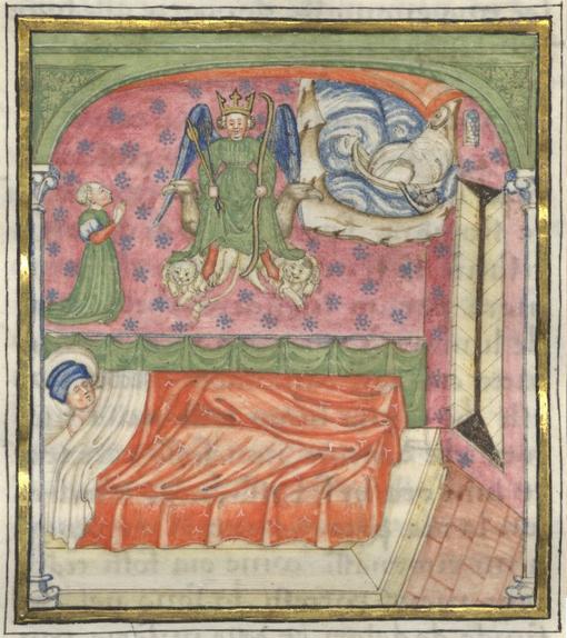 Kassel, Universitätsbibliothek Kassel, Landesbibliothek und Murhardsche Bibliothek der Stadt Kassel, 2° poet. et roman. 3, f. 75v. Florio, addormentato nel suo letto, sogna una figura alata dalle vesti regali con un arco e due frecce, seduta su due aquile e due leoni, ai cui lati compaiono una fanciulla inginocchiata ed una nave sorpresa dalla tempesta nell'atto di naufragare.