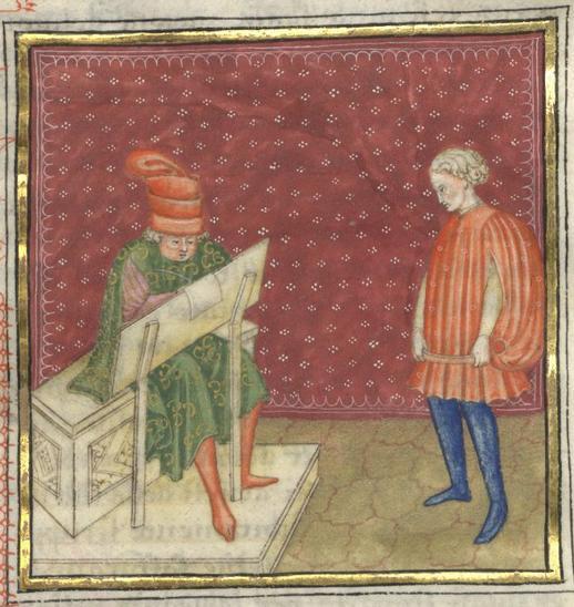 Kassel, Universitätsbibliothek Kassel, Landesbibliothek und Murhardsche Bibliothek der Stadt Kassel, 2° poet. et roman. 3, f. 76v. Florio scrive una lettera a Biancifiore prima di consegnarla ad un messo in attesa.