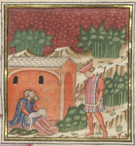 Miniatore lombardo (1450 c.), Fileno viene raggiunto nel bosco da un giovane uomo